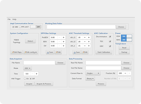 - One FEB/D board supplying the data and sending the data to the DAQ computer using a Gigabit Ethernet link. The FEB/D also receives configuration and clock signals from the ASICs, and bias voltages to the SiPMs.