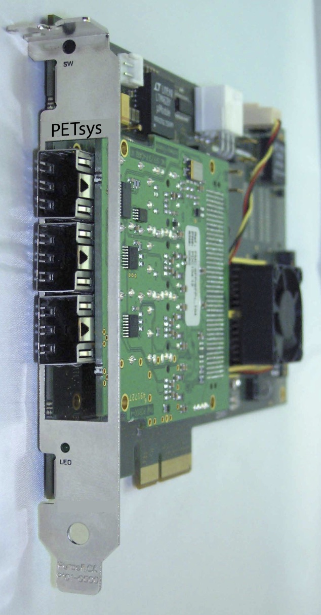 - Single PCIe board providing data acquisition of TOF PET ASICs