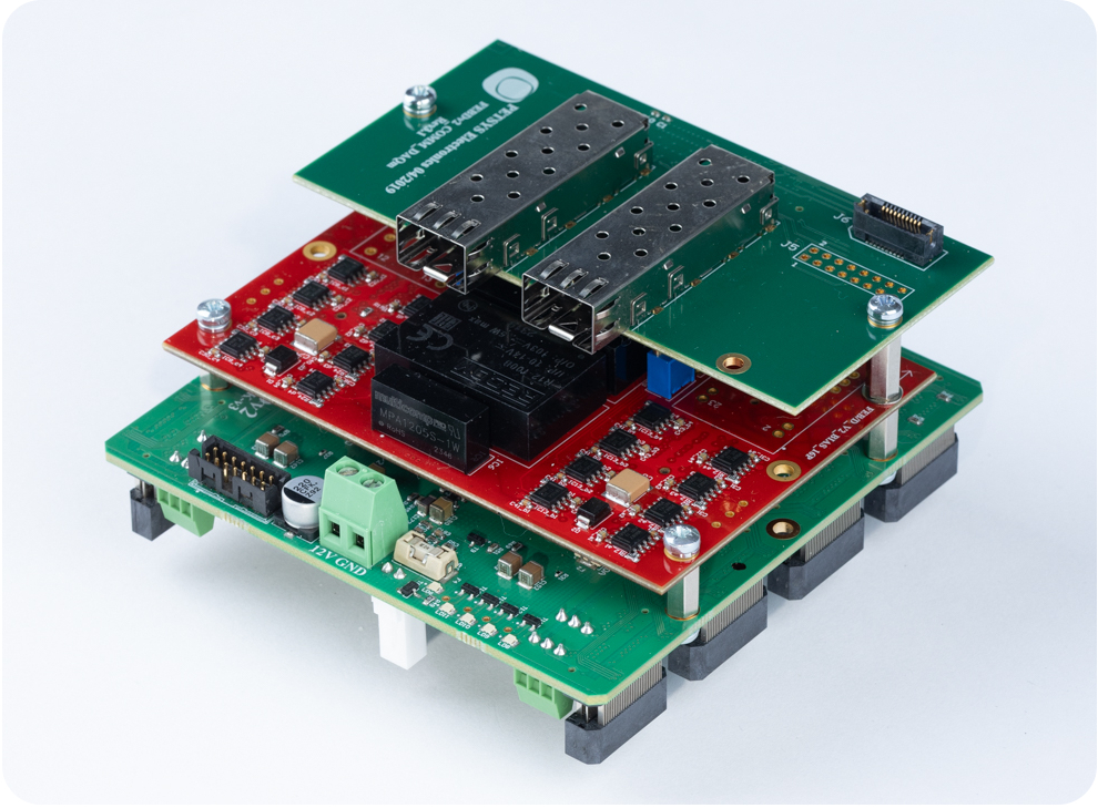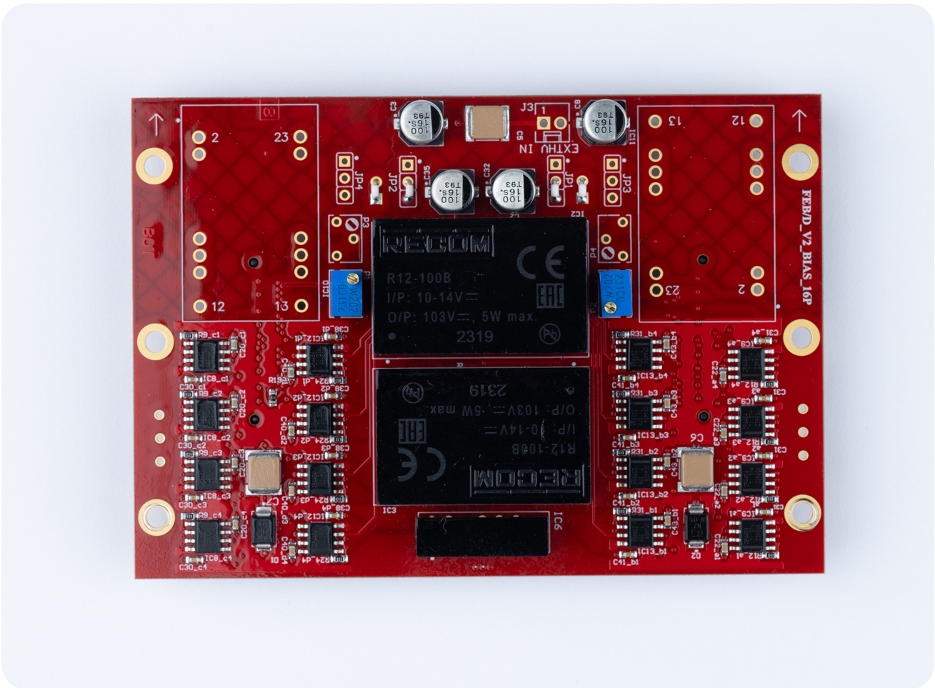 - Integrated bias voltage mezzanines supply adjustable voltages (0-72V) to SiPM arrays with configurable current options per line.